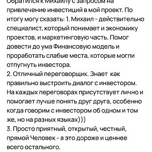 «Обратился к Михаилу с запросом на привлечение инвестиций в мой проект. По итогу могу сказать: 1. Михаил - действительно специалист, который понимает и экономику проектов, и маркетинговую часть. Помог довести до ума Финансовую модель и проработать слабые места, которые могли отпугнуть инвестора. 2. Отличный переговорщик. Знает как правильно выстроить диалог с инвестором. На каждых переговорах присутствует лично и помогает лучше понять друг друга, особенно когда говорим с инвестором об одном и том же, но на разных языках))) 3. Просто приятный, открытый, честный, прямой Человек - а это дороже и ценнее всего остального. Стоит ли с ним работать? Однозначно - Да. Михаил, благодарю тебя за отличный опыт и результат »