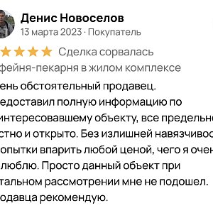 «Очень обстоятельный продавец. Предоставил полную информацию по заинтересовавшему объекту, все предельно честно и открыто. Без излишней навязчивости и попытки впарить любой ценой, чего я очень не люблю. Просто данный объект при детальном рассмотрении мне не подошел. Продавца рекомендую.»