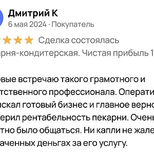 «Впервые встречаю такого грамотного и ответственного профессионала. Оперативно подыскал готовый бизнес и главное верно проверил рентабельность пекарни. Очень приятно было общаться. Ни капли не жалею о потраченных деньгах за его услугу.»
