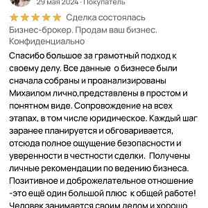 «Спасибо большое за грамотный подход к своему делу. Все данные о бизнесе были сначала собраны и проанализированы Михаилом лично,представлены в простом и понятном виде. Сопровождение на всех этапах, в том числе юридическое. Каждый шаг заранее планируется и обговаривается, отсюда полное ощущение безопасности и уверенности в честности сделки. Получены личные рекомендации по ведению бизнеса. Позитивное и доброжелательное отношение -это ещё один большой плюс к общей работе! Человек занимается своим делом и хорошо знает свою работу!»