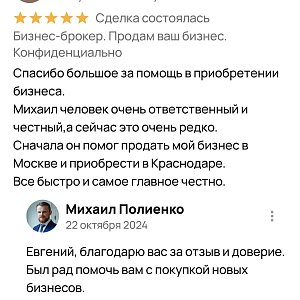 «Спасибо большое за помощь в приобретении бизнеса. Михаил человек очень ответственный и честный,а сейчас это очень редко. Сначала он помог продать мой бизнес в Москве и приобрести в Краснодаре. Все быстро и самое главное честно.»