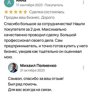 «Спасибо большое за сотрудничества! Нашли покупателя за 2 дня. Максимально качественно проводил сделку. Большой профессионал своего дела. Сам предприниматель, и точно готов купить у него бизнес, увидев как тщательно он оценивал мою.»