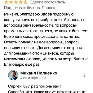 «Михаил, благодарю Вас за подробную консультацию по приобретению бизнеса, по вопросам рентабельности, по вопросам временных затрат на него, по нише в бизнесе! Все очень емко, профессионально, четко. Ответы получил на все вопросы , вопросы появились новые. Договорились о встрече для понимания о том бизнесе, который максимально подходит под мои потребности! Благодарю еще раз»