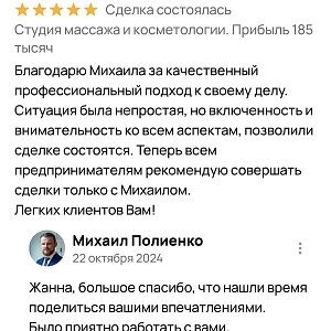 «Благодарю Михаила за качественный профессиональный подход к своему делу. Ситуация была непростая, но включенность и внимательность ко всем аспектам, позволили сделке состоятся. Теперь всем предпринимателям рекомендую совершать сделки только с Михаилом. Легких клиентов Вам!»